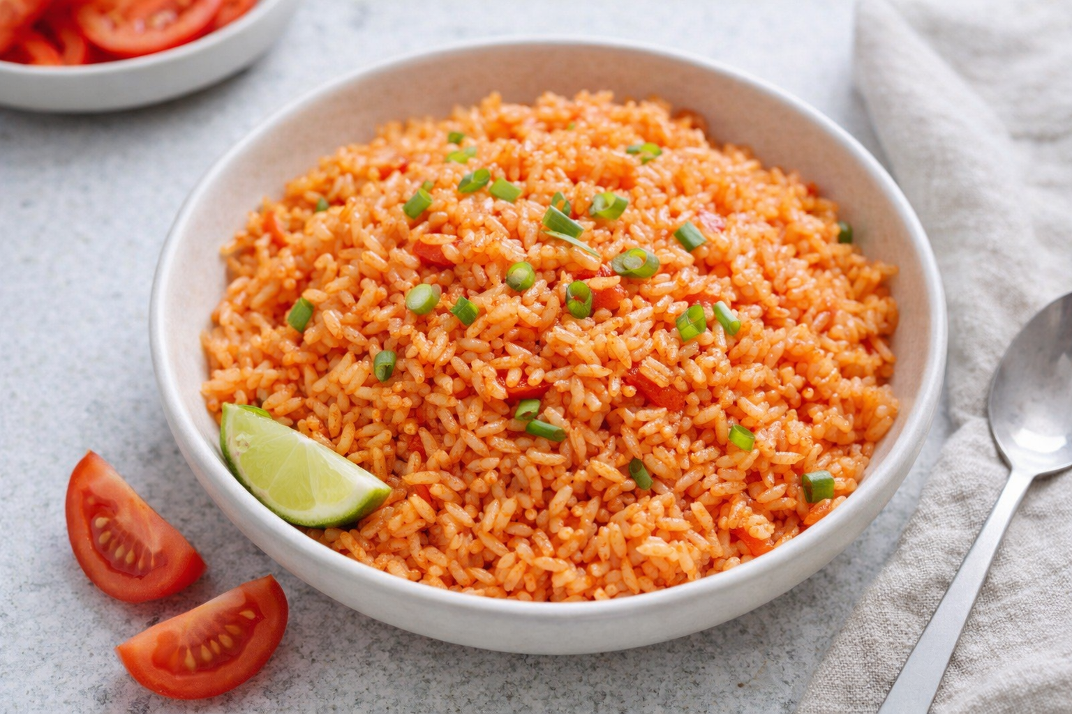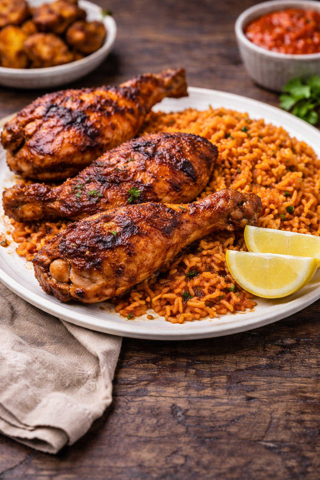 Authentic Nigerian Jollof Rice with tender chicken, rich tomato sauce, and aromatic spices that warm the soul.