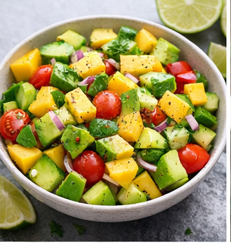 2 cups lettuce, washed and chopped, 1 cup cucumber, sliced, 1 cup tomatoes, diced, 1 cup carrots, grated, 1 Avocado cubed.