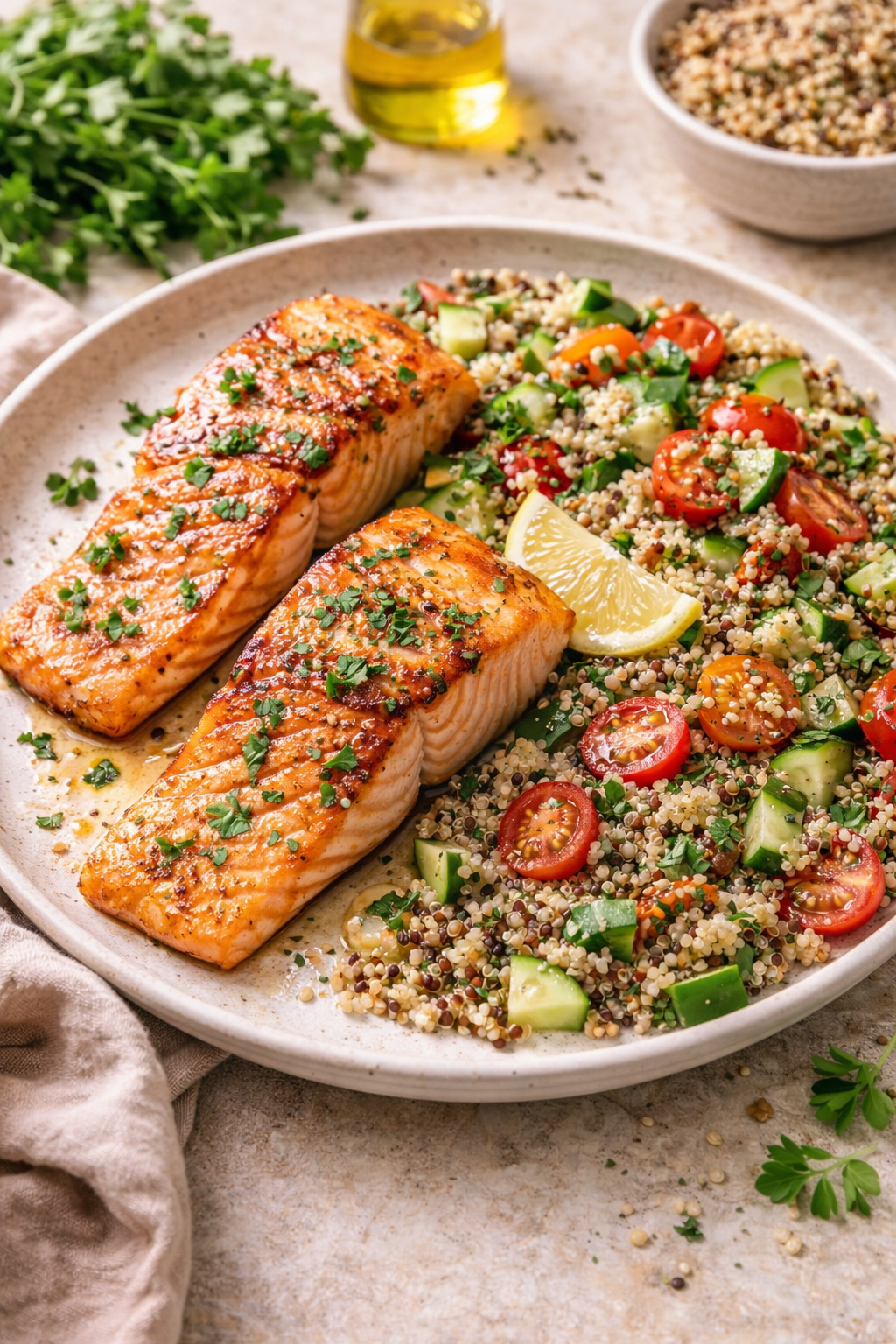 Ingredients: 2 salmon fillets, 2 cups broccoli florets, 2 tablespoons olive oil, 1 teaspoon lemon juice, ½ teaspoon salt, ¼ teaspoon black pepper.