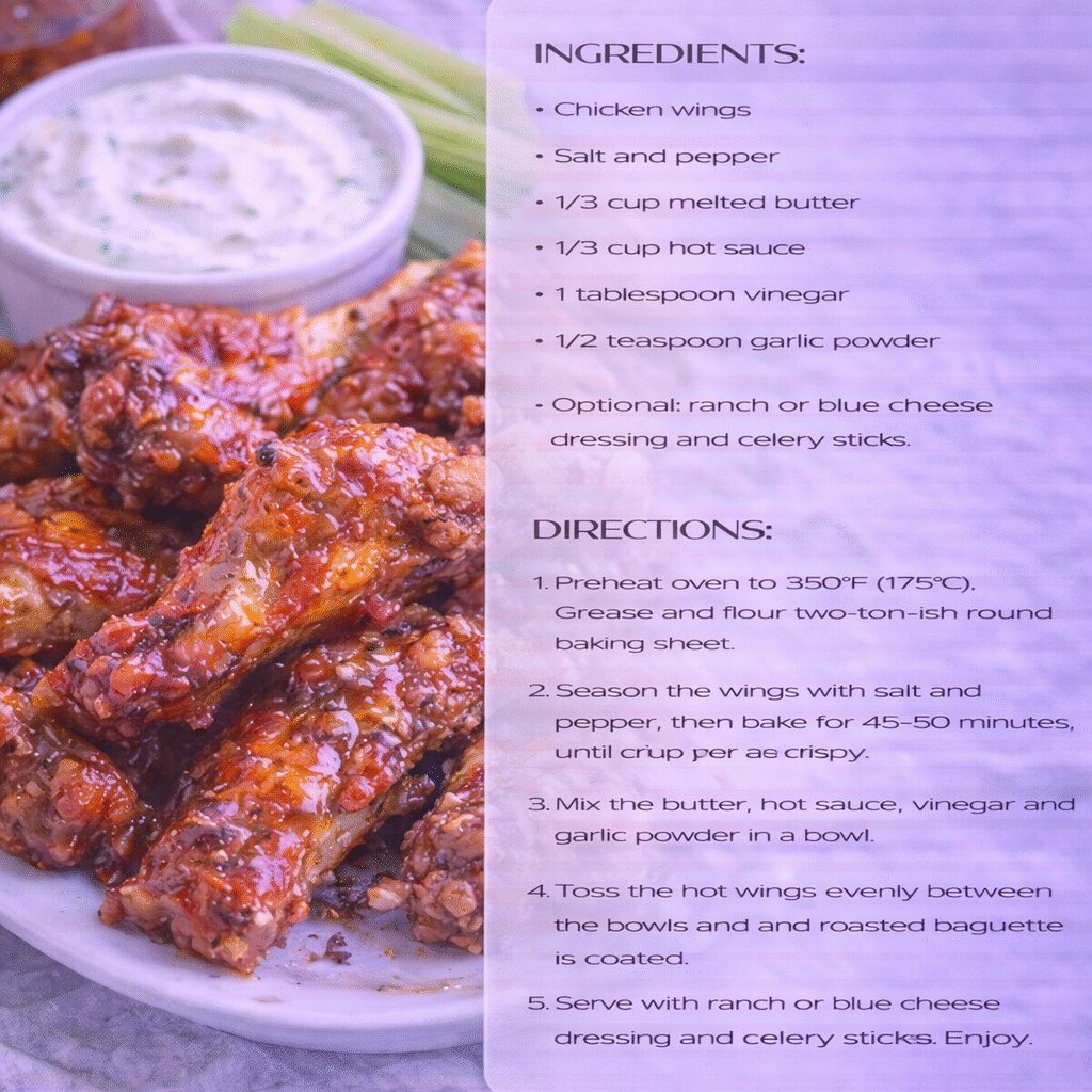 Place the fried wings in a large bowl. Pour the warm buffalo sauce over the wings and toss gently until well coated., Serve hot., Buffalo wings are best served with fresh vegetables, a light yogurt or cream-based dip, and a squeeze of lemon for balance., Value, Buffalo wings provide protein and energy while offering bold flavor and satisfaction. When enjoyed in moderation, they are a fun and comforting meal for gatherings and family moments. Nutrition Information (Approximate per serving) Calories 500 kcal Protein 30 gCarbohydrates 16 gFat 34 g
